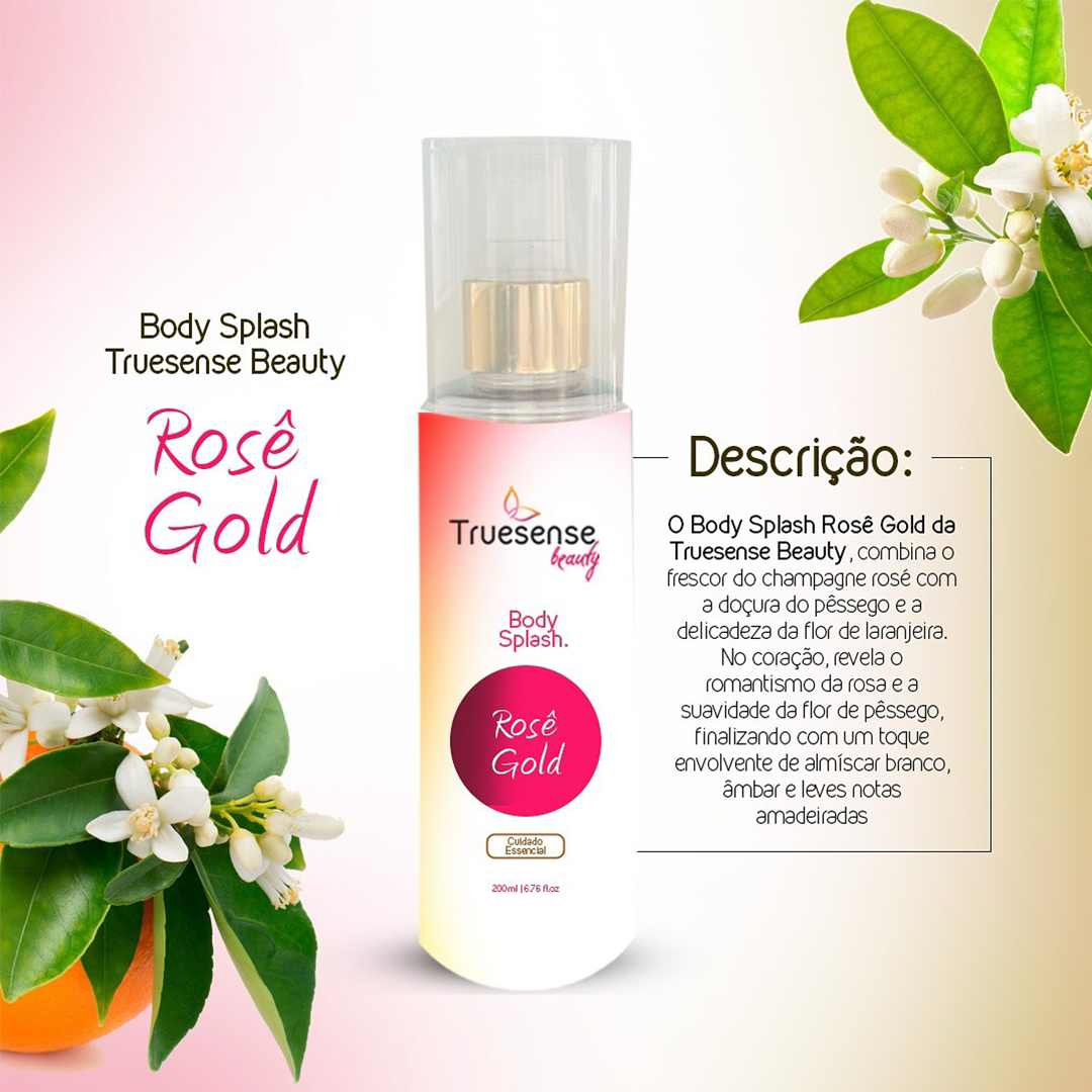 Uma fragrância feminina vibrante, feminina e sofisticada. O Body Splash Rosê Gold da Truesense Beauty, combina o frescor do champagne rosé com a doçura do pêssego e a delicadeza da flor de laranjeira. No coração, revela o romantismo da rosa e a suavidade da flor de pêssego, finalizando com um toque envolvente de almíscar branco, âmbar e leves notas amadeiradas.