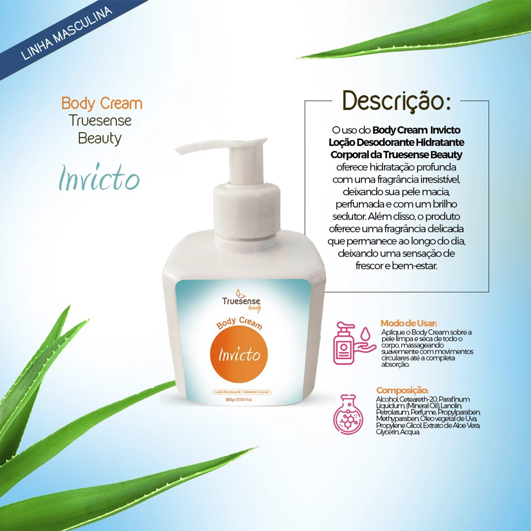 O uso do Body Cream Invicto e loção desodorante hidratante corporal da Truesense Beauty oferece hidratação profunda com uma fragrância irresistível, deixando sua pele macia, perfumada e com um brilho sedutor. Além disso, o produto oferece uma fragrância delicada que permanece ao longo do dia, deixando uma sensação de frescor e bem-estar.