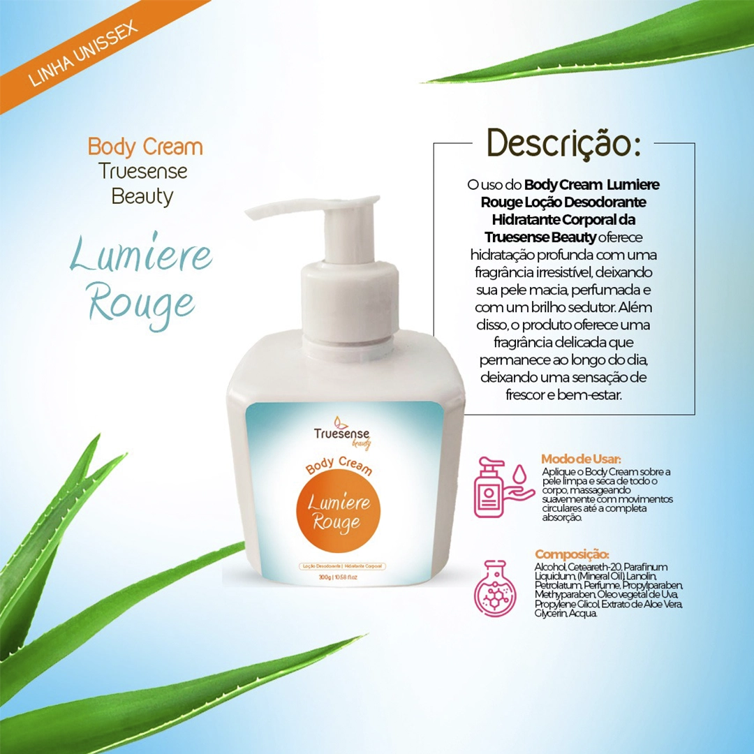Modo de usar: USO EXTERNO. Aplique o Body Cream sobre a pele limpa e seca de todo o corpo, massageando suavemente com movimentos circulares até a completa absorção.