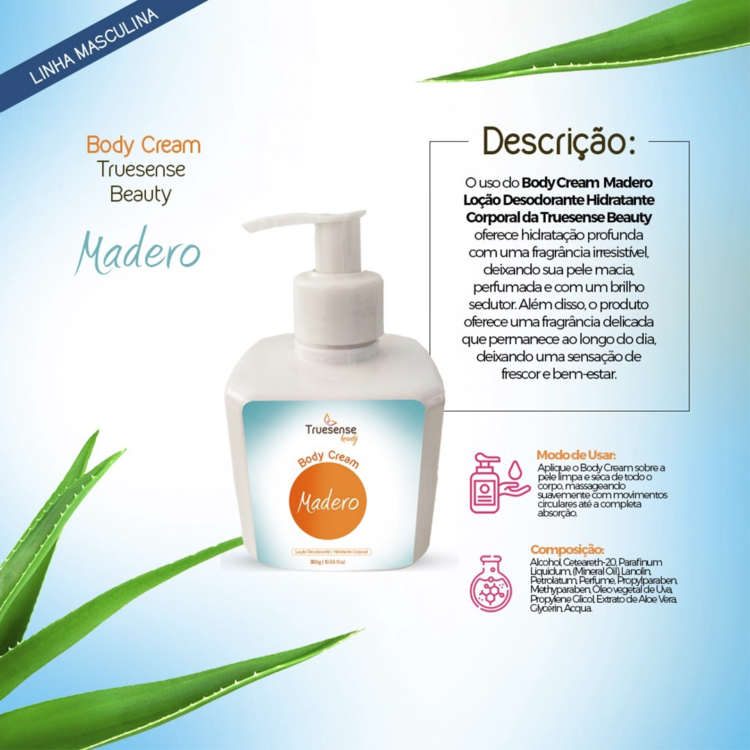 O uso do Body Cream Madero e loção desodorante hidratante corporal da Truesense Beauty oferece hidratação profunda com uma fragrância irresistível, deixando sua pele macia, perfumada e com um brilho sedutor. Além disso, o produto oferece uma fragrância delicada que permanece ao longo do dia, deixando uma sensação de frescor e bem-estar.