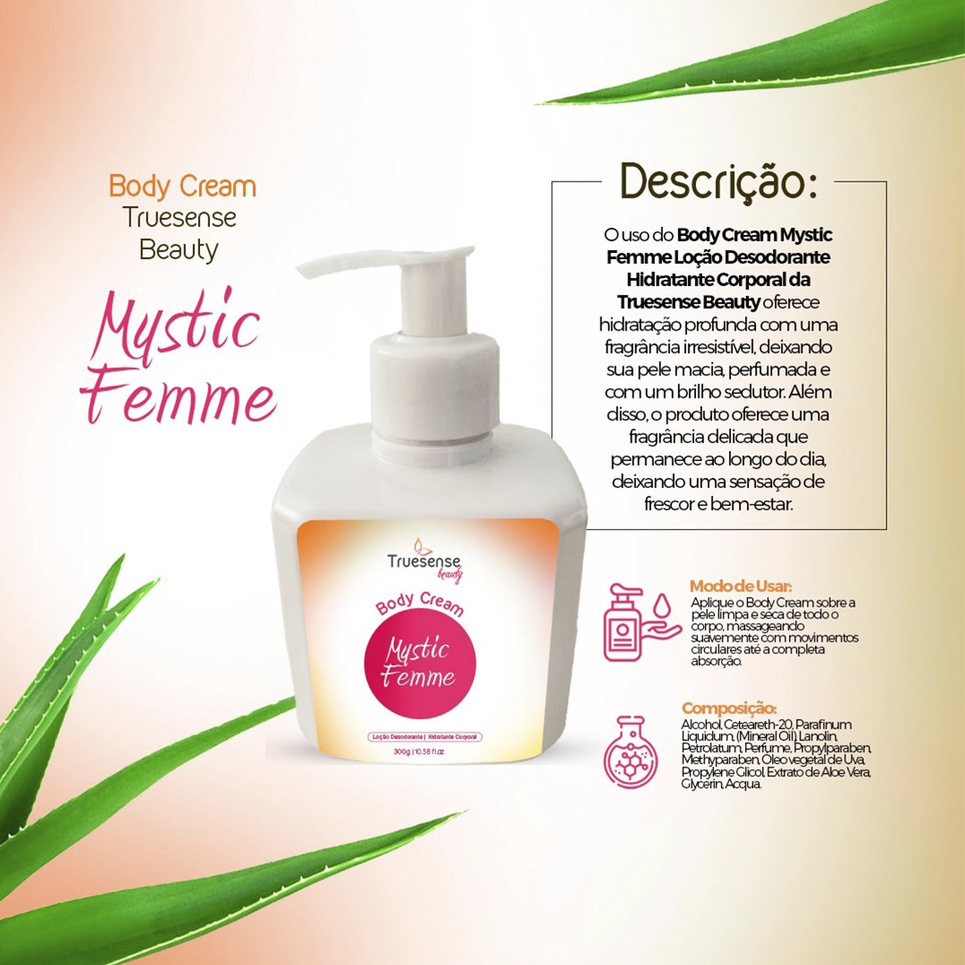 O uso do Body Cream Mystic Femme e loção desodorante hidratante corporal da Truesense Beauty oferece hidratação profunda com uma fragrância irresistível, deixando sua pele macia, perfumada e com um brilho sedutor. Além disso, o produto oferece uma fragrância delicada que permanece ao longo do dia, deixando uma sensação de frescor e bem-estar.