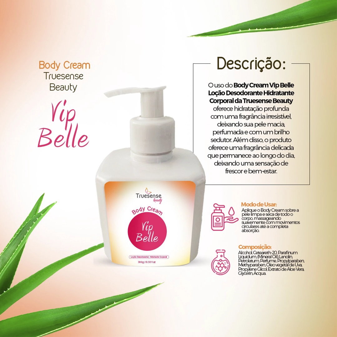 O uso do Body Cream Vip Belle Loção Desodorante Hidratante Corporal da Truesense Beauty oferece hidratação profunda com uma fragrância irresistível, deixando sua pele macia, perfumada e com um brilho sedutor. Além disso, o produto oferece uma fragrância delicada que permanece ao longo do dia, deixando uma sensação de frescor e bem-estar.