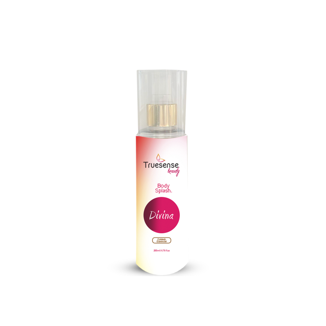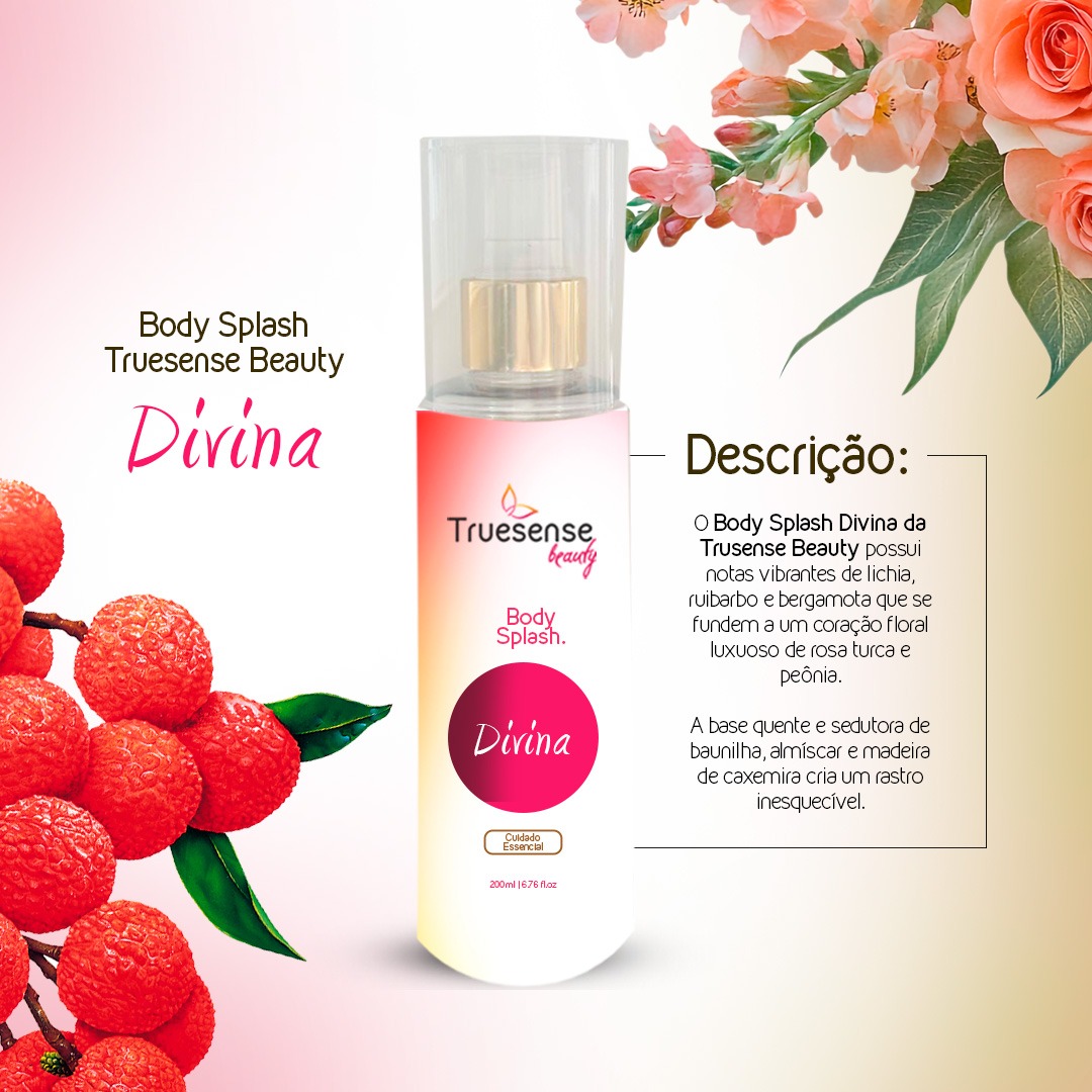 Uma fragrância envolvente e sofisticada que exala feminilidade e elegância. O Body Splash Divina da Trusense Beauty possui notas vibrantes de lichia, ruibarbo e bergamota que se fundem a um coração floral luxuoso de rosa turca e peônia. A base quente e sedutora de baunilha, almíscar e madeira de caxemira cria um rastro inesquecível.