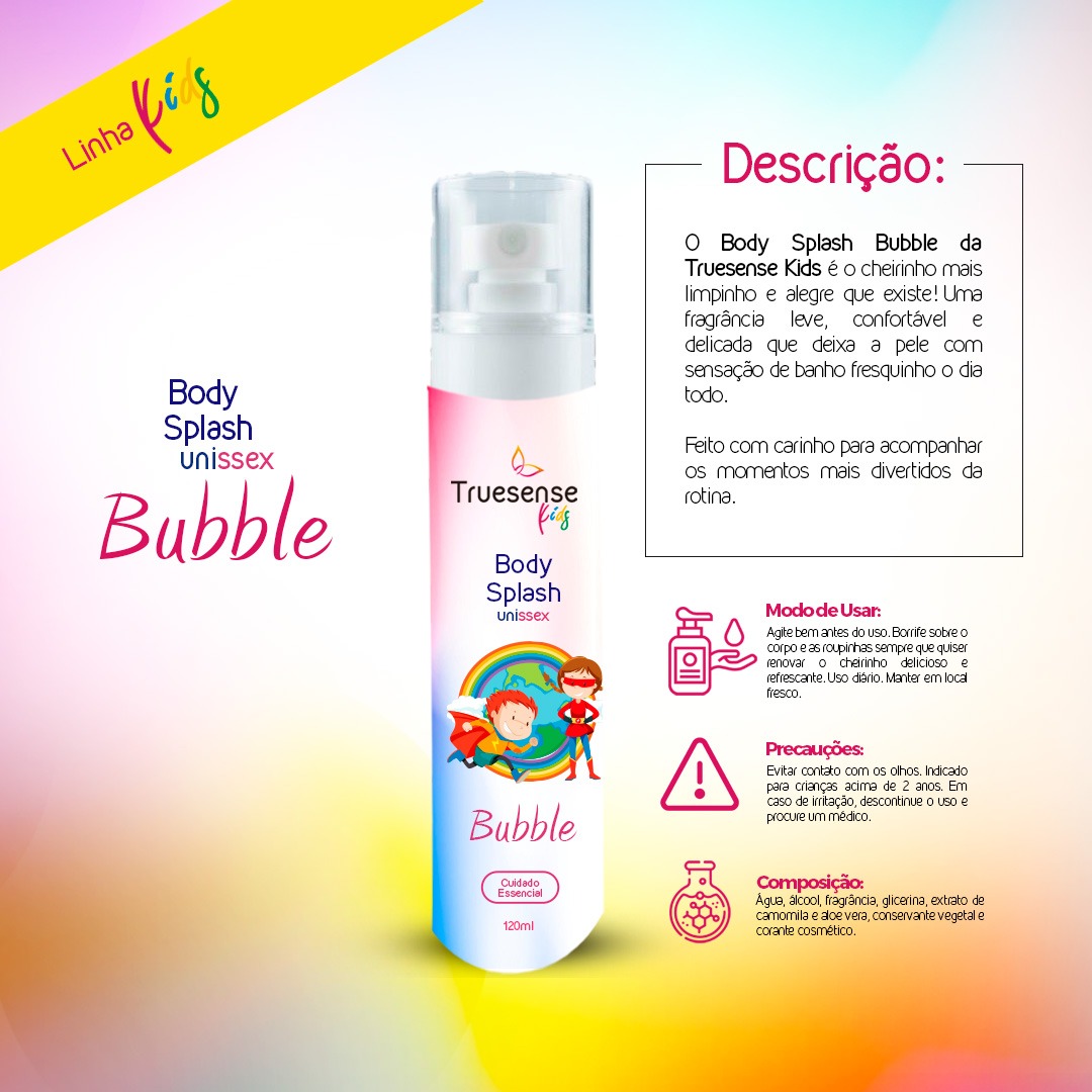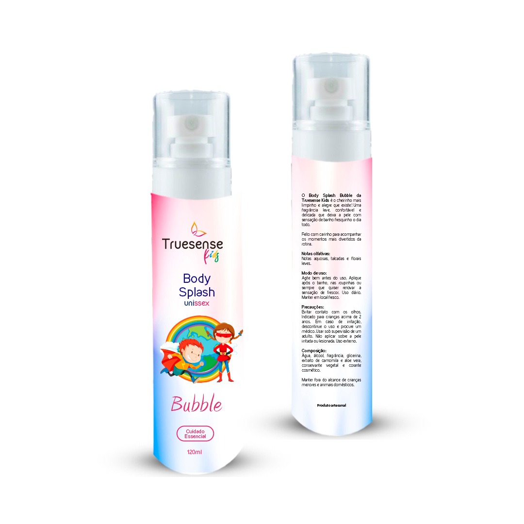 O Body Splash Bubble da Truesense Kids é o cheirinho mais limpinho e alegre que existe! Uma fragrância leve, confortável e delicada que deixa a pele com sensação de banho fresquinho o dia todo.
