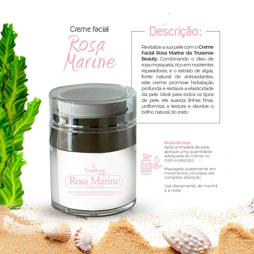 Revitalize a sua pele com o Creme Facial Rosa Marine da Trusense Beauty. Combinando o óleo de rosa mosqueta, rico em nutrientes reparadores, e o extrato de algas, fonte natural de antioxidantes, este creme promove hidratação profunda e restaura a elasticidade da pele. Ideal para todos os tipos de pele, ele suaviza linhas finas, uniformiza a textura e devolve o brilho natural do rosto.