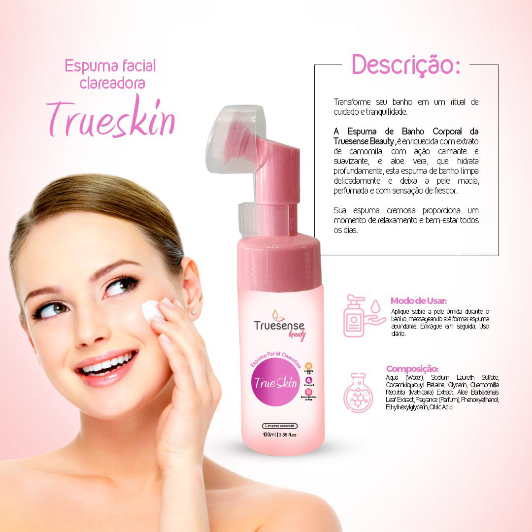 A Espuma Facial Clareadora *TrueSkin da Truesense Beauty foi desenvolvida para proporcionar uma limpeza profunda enquanto hidrata e uniformiza o tom da pele. Com uma combinação poderosa de ativos clareadores e antioxidantes, ela elimina impurezas, devolve a luminosidade natural e deixa a pele visivelmente renovada.